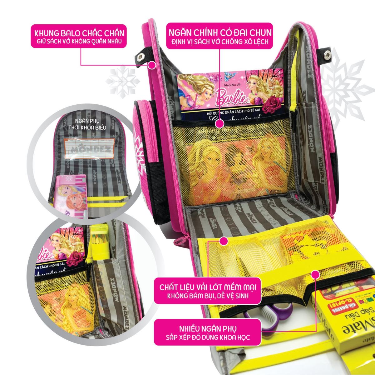 • Khung balo chắc chắn, ngăn chính được thiết kế mở hoàn toàn 360o  giữ sách vở không quăn nhàu.